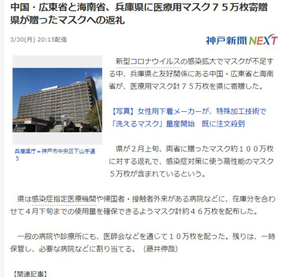 比如,《神戶新聞》3月30日報道,為了表達感謝,共抗時艱,中國的廣東,海南兩省向日本兵庫縣贈送了75萬枚口罩 – 2月上旬,兵庫縣曾向兩省捐贈了100萬枚口罩 – 日本記者寫道,為了彌補數(shù)量上的差距,細心的中國人還專門在這批物資中包含了5萬枚專門對應(yīng)新冠病毒的特種高性能口罩。