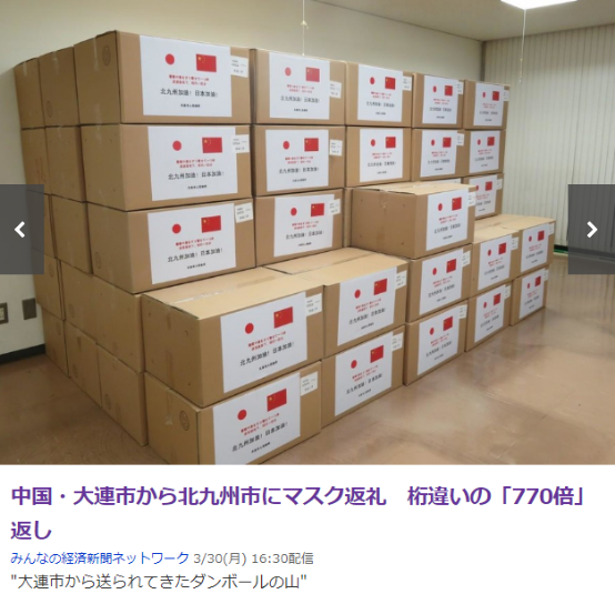 而大連方面給友好城市北九州寄贈的還禮,也已經(jīng)到達那里了。因為北九州早些時候寄送給大連的主要物資是防護服,而口罩的數(shù)量不多(只有260枚),所以大連這次返贈的口罩達到了日方捐贈的770倍。