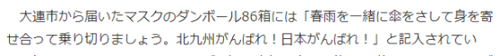 當日方報道大連方面寄贈口罩給北九州時,提到大連的八十六個口罩包裝箱上都有“春雨を一緒に傘をさして身を寄せ合って乗り切りましょう。北九州がんばれ!日本がんばれ!”字樣的留言。大致的意思是 – 在春雨中我們共打一把傘,一起度過難關(guān)。北九州加油,日本加油。然而,因為日方新聞上圖片太小,筆者實在分辨不出大連的朋友究竟寫了什么,出自什么典故,考慮到雙方的交流充滿了“山川異域”和“一衣帶水”這樣的優(yōu)雅,真不知道大連那邊,這次又引用了怎樣優(yōu)美的詩句。