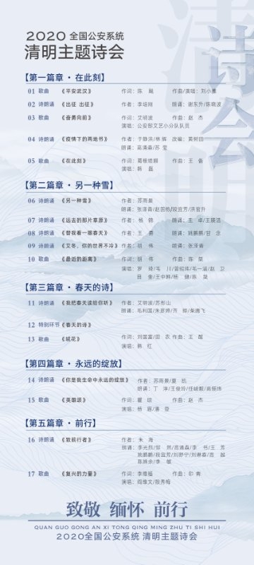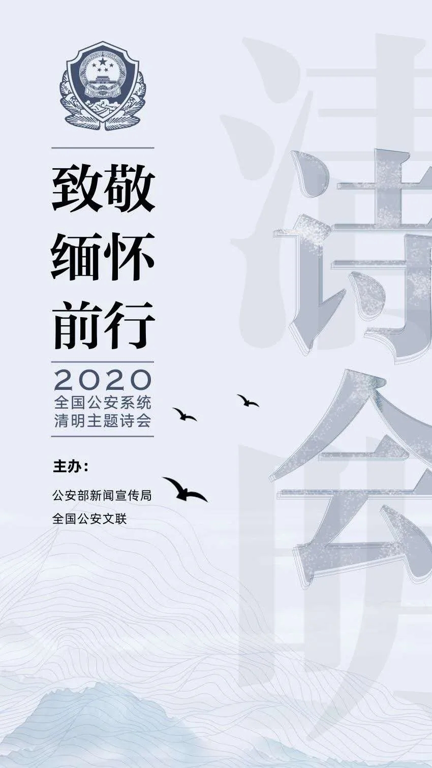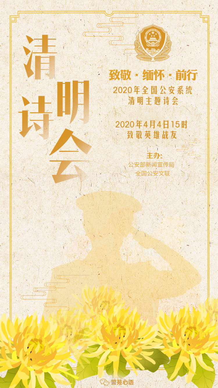 央廣網(wǎng)北京4月3日消息 年年芳草綠,今又清明時(shí)。由公安部新聞宣傳局與全國(guó)公安文聯(lián)共同主辦的“致敬·緬懷·前行”2020年全國(guó)公安系統(tǒng)清明主題詩(shī)會(huì),將于4月4日15時(shí)在全網(wǎng)播出。主題詩(shī)會(huì)采用音詩(shī)畫(huà)藝術(shù)形式,通過(guò)非現(xiàn)場(chǎng)、云制作的方式,緬懷公安英烈,追思英雄事跡,弘揚(yáng)英烈精神,激勵(lì)廣大公安民警輔警忠實(shí)履行黨和人民賦予的新時(shí)代使命任務(wù)。
