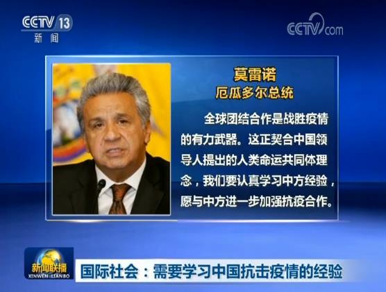 厄瓜多爾總統(tǒng)莫雷諾表示,全球團(tuán)結(jié)合作是戰(zhàn)勝疫情的有力武器。這正契合中國(guó)領(lǐng)導(dǎo)人提出的人類(lèi)命運(yùn)共同體理念,我們要認(rèn)真學(xué)習(xí)中方經(jīng)驗(yàn),愿與中方進(jìn)一步加強(qiáng)抗疫合作。