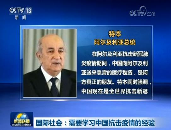 阿爾及利亞總統(tǒng)特本表示,在阿爾及利亞抗擊新冠肺炎疫情期間,中國(guó)向阿爾及利亞送來(lái)急需的醫(yī)療物資,是阿方真正的朋友。特本同時(shí)強(qiáng)調(diào),中國(guó)現(xiàn)在是全世界抗擊新冠肺炎疫情中少數(shù)有能力為其他國(guó)家提供醫(yī)療援助和支持的力量。