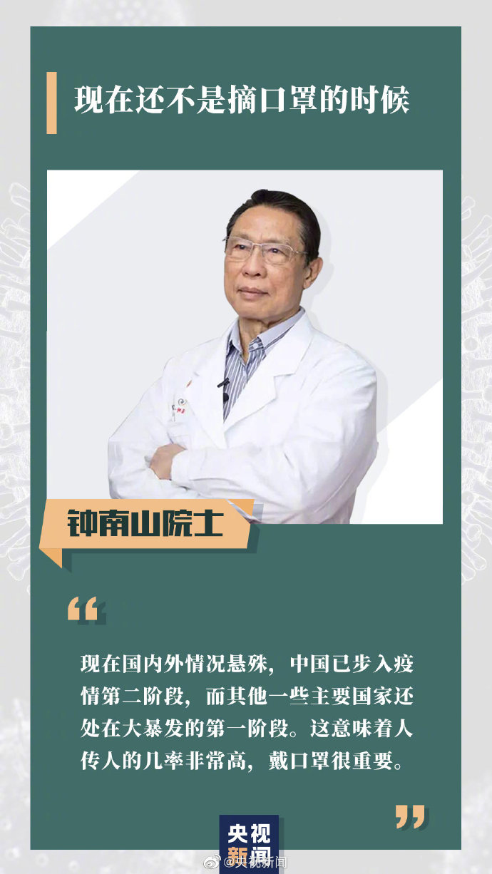 鐘南山:現(xiàn)在國(guó)內(nèi)外情況懸殊,中國(guó)由于采取了非常果斷的措施,已步入疫情第二階段,而其他一些主要國(guó)家還處在大暴發(fā)的第一階段,且仍在向上攀升。這意味著人傳人的幾率非常高,確診病例增加非常快。戴口罩仍是很重要的自我防護(hù)手段,但在疫情不嚴(yán)重的地區(qū),人少的地方或空曠場(chǎng)所,倒不見得必須戴。