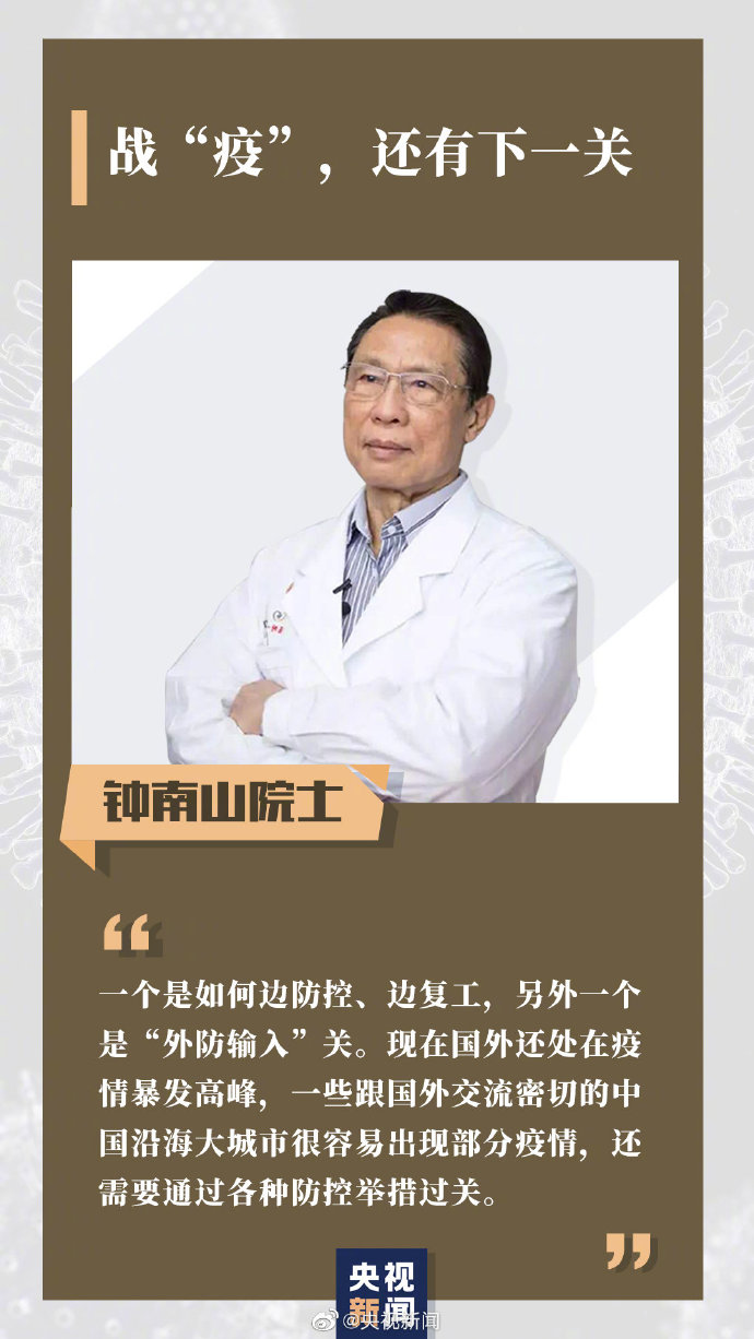 鐘南山:疫情發(fā)生后,中央果斷出手,對(duì)武漢城市交通進(jìn)行管控,其他地方采取群防群治措施是非常成功的。在疫情防控史上,這也稱得上是一個(gè)壯舉。但接下來(lái)仍然面臨兩個(gè)考驗(yàn):一是如何邊防控、邊復(fù)工,另一個(gè)則是“外防輸入”關(guān)。目前,國(guó)外疫情還處在暴發(fā)高峰期,一些與國(guó)外交流密切的中國(guó)沿海大城市很容易被“卷進(jìn)去”,進(jìn)而出現(xiàn)部分疫情。可以說(shuō),武漢的下一個(gè)“關(guān)”,也是全國(guó)的這一“關(guān)”,還需要通過(guò)各種防控舉措過(guò)關(guān)。