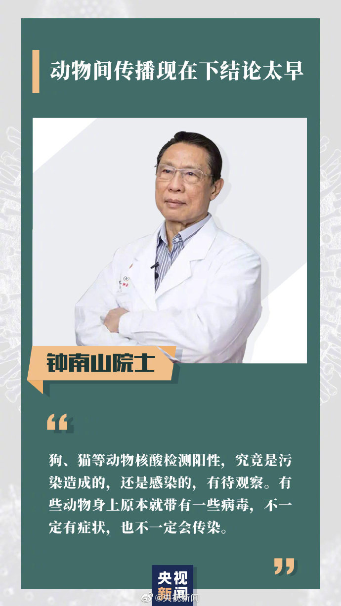 鐘南山:狗、貓、老虎等一些動(dòng)物核酸檢測(cè)陽(yáng)性,究竟是污染造成的,還是感染的,還有待觀察。有些動(dòng)物身上原本就帶有一些病毒,不一定有癥狀,也不一定會(huì)傳染。現(xiàn)在認(rèn)為這些動(dòng)物身上的新冠病毒既能傳染人,又能傳染動(dòng)物,而且都能致病,這個(gè)結(jié)論為時(shí)過(guò)早。