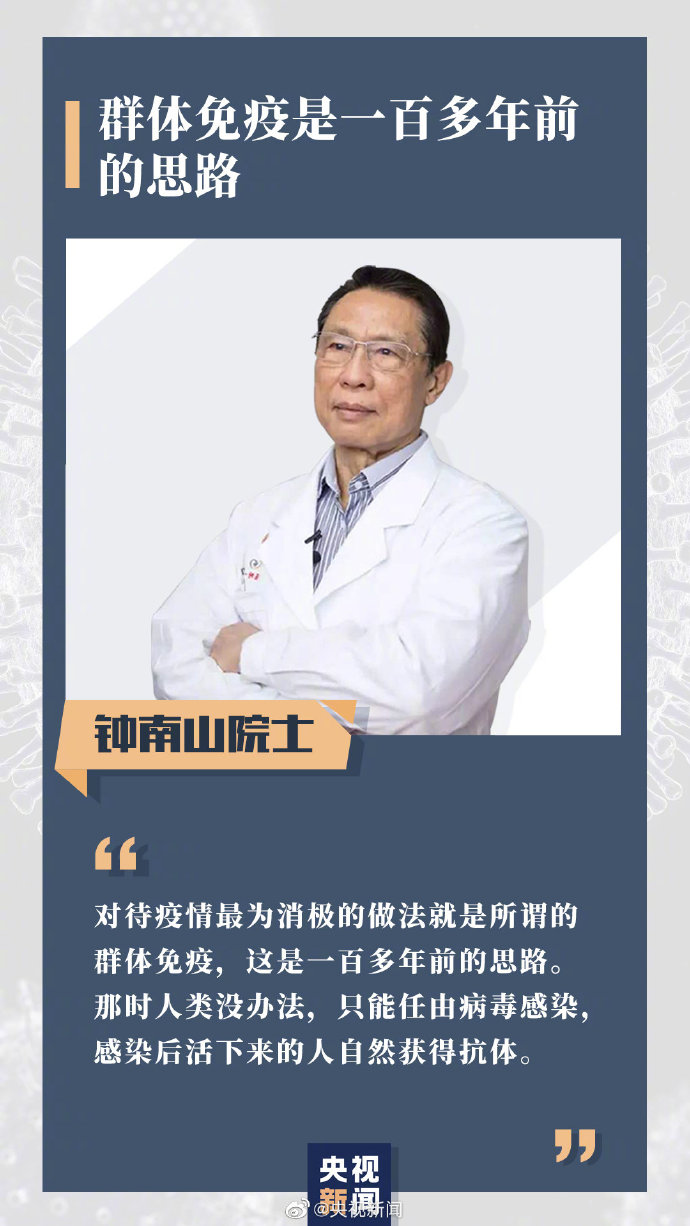 鐘南山:對(duì)待疫情最為消極的做法就是所謂“群體免疫”,這是一百多年前的思路。那時(shí)人類沒(méi)有什么辦法,只能任由病毒感染,感染后活下來(lái)的人自然獲得抗體,我不贊同再用這種方法應(yīng)對(duì)新冠病毒。在過(guò)去一百多年里,人類取得很大進(jìn)步,有很多辦法預(yù)防,不需要再用自然免疫、群體免疫。