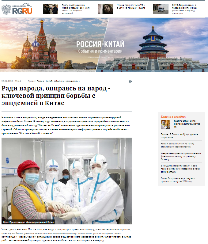 俄羅斯最具權(quán)威性和影響力的國(guó)家政府機(jī)關(guān)報(bào)《俄羅斯報(bào)》官網(wǎng)26日發(fā)表題為《為了人民、依靠人民——中國(guó)抗疫的關(guān)鍵準(zhǔn)則》的文章。文章稱,許多人想知道為什么中國(guó)在相當(dāng)短的時(shí)間內(nèi)成功應(yīng)對(duì)此次突發(fā)公共衛(wèi)生事件。答案很簡(jiǎn)單:在中國(guó)行得通的不變?cè)瓌t就是,一切為了人民,一切依靠人民。