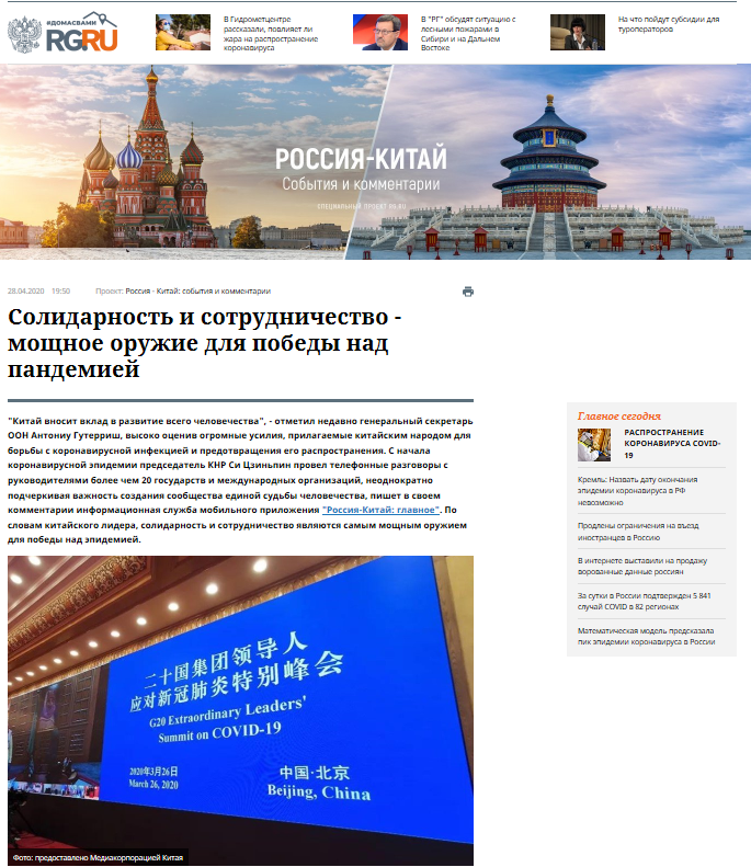 28日,《俄羅斯報(bào)》官網(wǎng)發(fā)表題為《團(tuán)結(jié)合作是抗疫最有力的武器》的文章。文章稱,疫情發(fā)生以來(lái),習(xí)近平主席同20多位外國(guó)領(lǐng)導(dǎo)人和國(guó)際組織領(lǐng)導(dǎo)人通電話時(shí),始終強(qiáng)調(diào)“人類是一個(gè)命運(yùn)共同體”,強(qiáng)調(diào)“團(tuán)結(jié)合作是最有力的武器”。