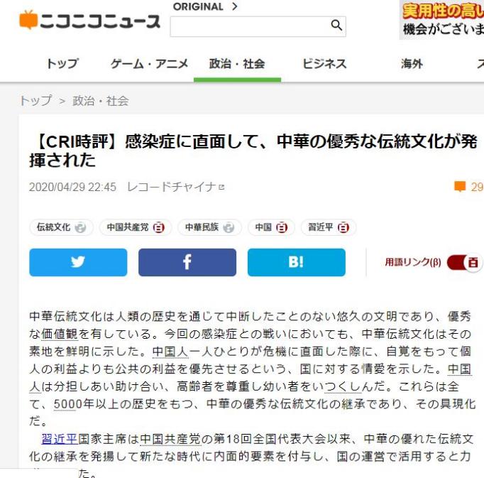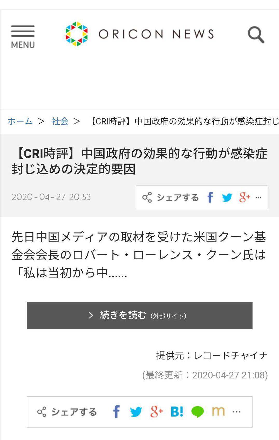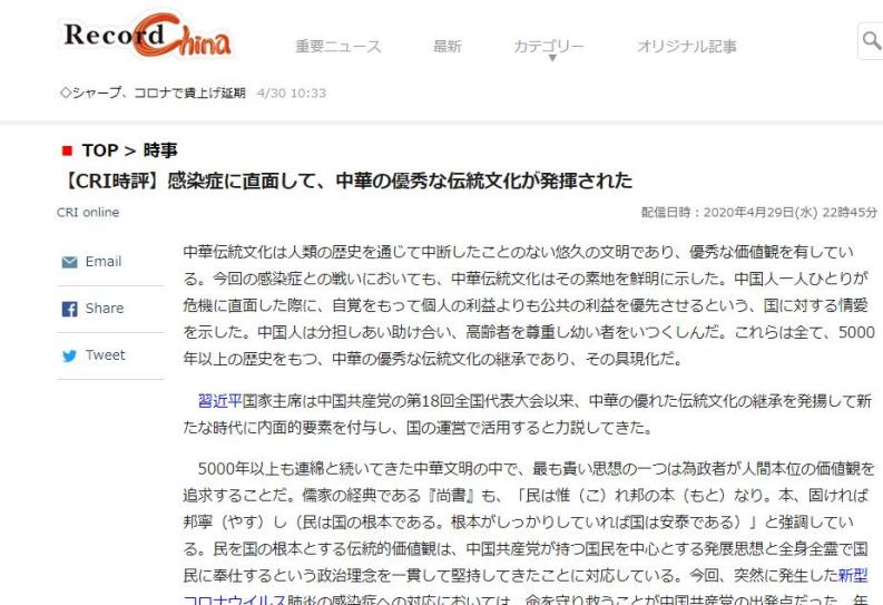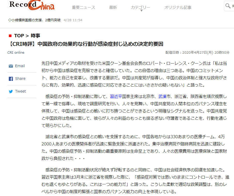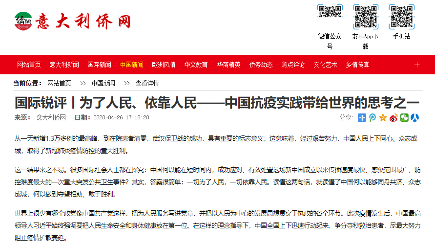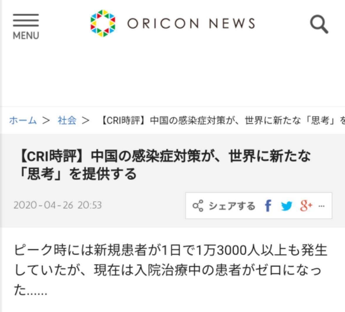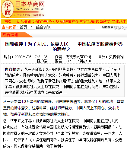 27日,Record China、Oricon等網(wǎng)站都發(fā)表題為《中國(guó)政府的有效措施是戰(zhàn)勝疫情的決定性因素》的文章。文章稱,中國(guó)共產(chǎn)黨所持的治國(guó)理念是“以人為本”,所以在危機(jī)面前,中國(guó)共產(chǎn)黨和中國(guó)政府成為了堅(jiān)定的廣大人民利益守護(hù)者,并且通過(guò)自己的行動(dòng)表明了這個(gè)理念。