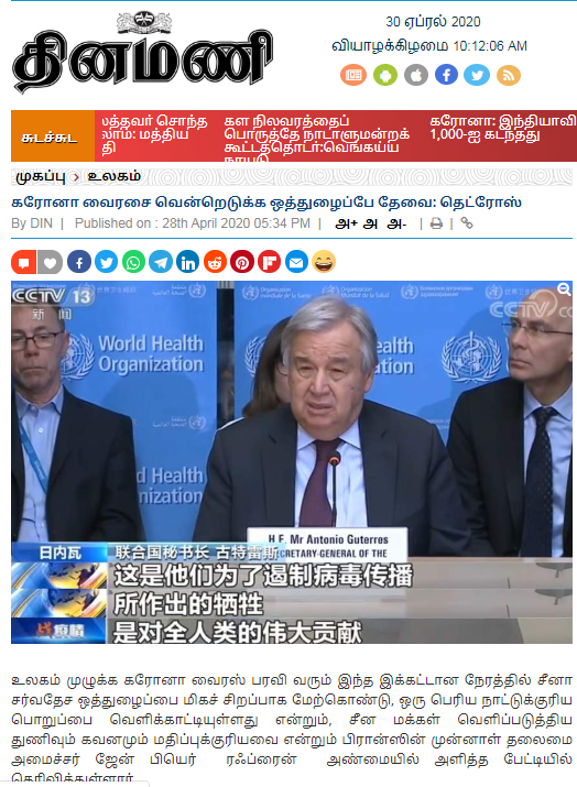 4月28日,印度《每日鐘聲報(bào)》網(wǎng)站在其國(guó)際新聞版塊發(fā)表題為《世衛(wèi)組織號(hào)召加強(qiáng)團(tuán)結(jié)合作》的文章。文章稱,世衛(wèi)組織表示中國(guó)在抗疫方面有成功的經(jīng)驗(yàn),現(xiàn)在急需的是各國(guó)吸取這些經(jīng)驗(yàn)并加強(qiáng)合作。