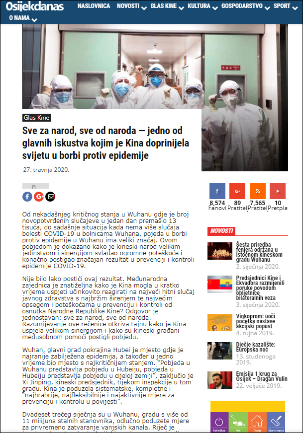 克羅地亞“奧西耶克媒體集團(tuán)”旗下綜合性門戶網(wǎng)站“今日奧西耶克” 27日發(fā)表題為《為了人民、依靠人民——中國(guó)抗疫實(shí)踐帶給世界的思考》的文章。文章稱,很多國(guó)際社會(huì)人士都在探究:中國(guó)何以能在短時(shí)間內(nèi),成功應(yīng)對(duì)、有效處置這場(chǎng)新中國(guó)成立以來(lái)傳播速度最快、感染范圍最廣、防控難度最大的一次重大突發(fā)公共衛(wèi)生事件?其實(shí),答案很簡(jiǎn)單:一切為了人民,一切依靠人民。