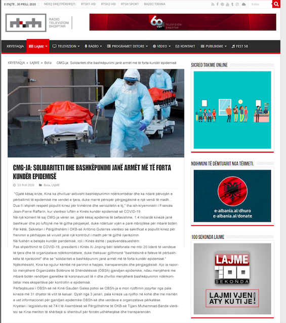 阿爾巴尼亞國(guó)家廣播電視臺(tái):中國(guó)倡導(dǎo)團(tuán)結(jié)合作應(yīng)對(duì)疫情