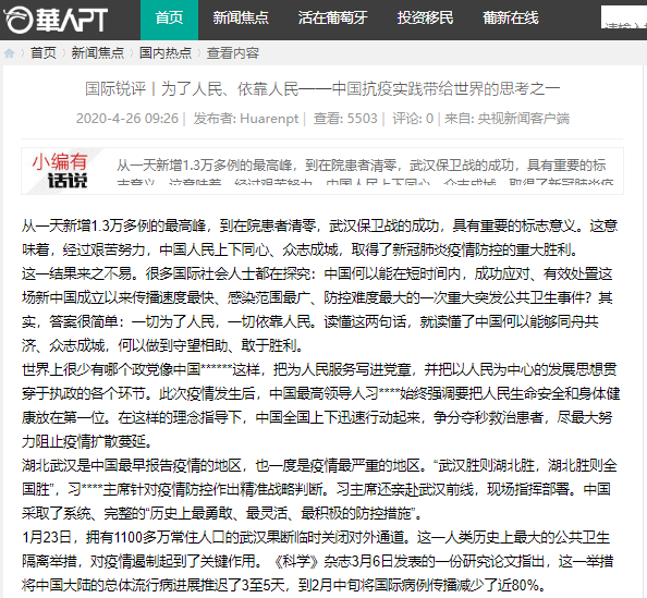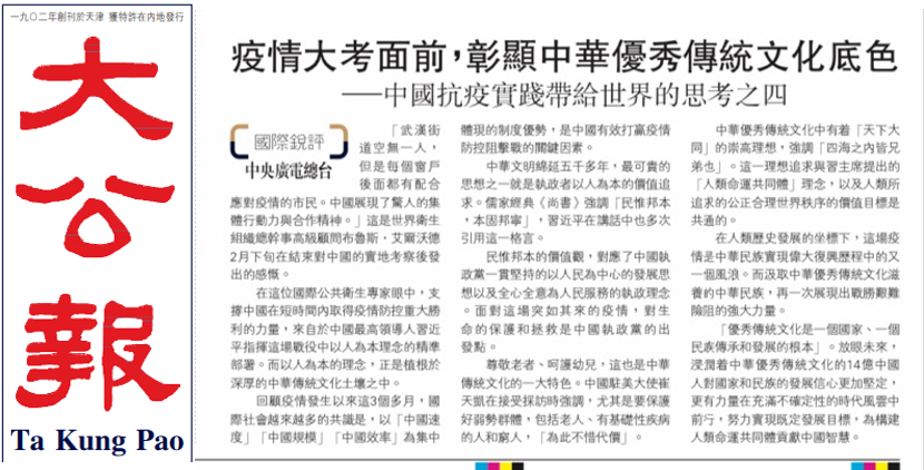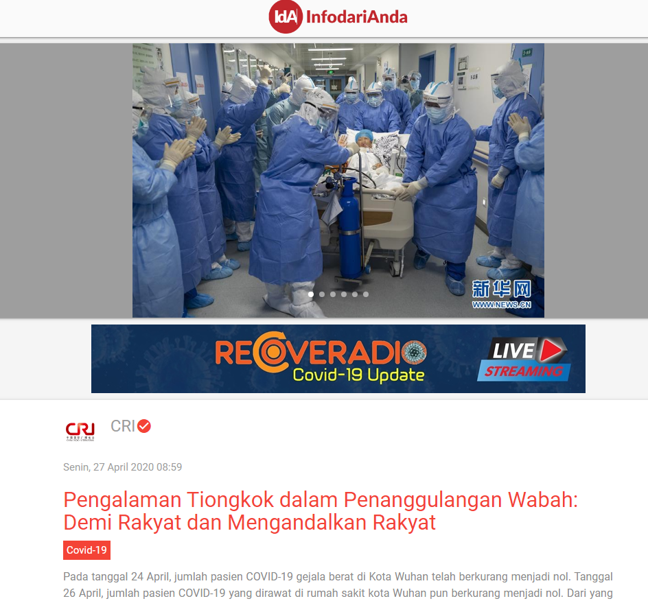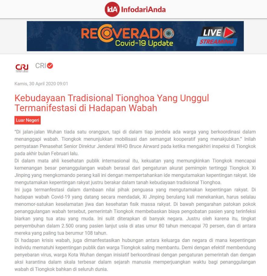 4月30日,印度尼西亞最大的電臺(tái)新聞網(wǎng)站艾爾辛達(dá)電臺(tái)刊發(fā)題為《疫情大考面前,彰顯中華優(yōu)秀傳統(tǒng)文化底色——中國(guó)抗疫實(shí)踐帶給世界的思考》的文章。文章稱,支撐中國(guó)在短時(shí)間內(nèi)取得疫情防控重大勝利的力量,來(lái)自于中國(guó)最高領(lǐng)導(dǎo)人習(xí)近平指揮這場(chǎng)戰(zhàn)役中以人為本理念的精準(zhǔn)部署。而以人為本的理念,正是植根于深厚的中華傳統(tǒng)文化土壤之中。