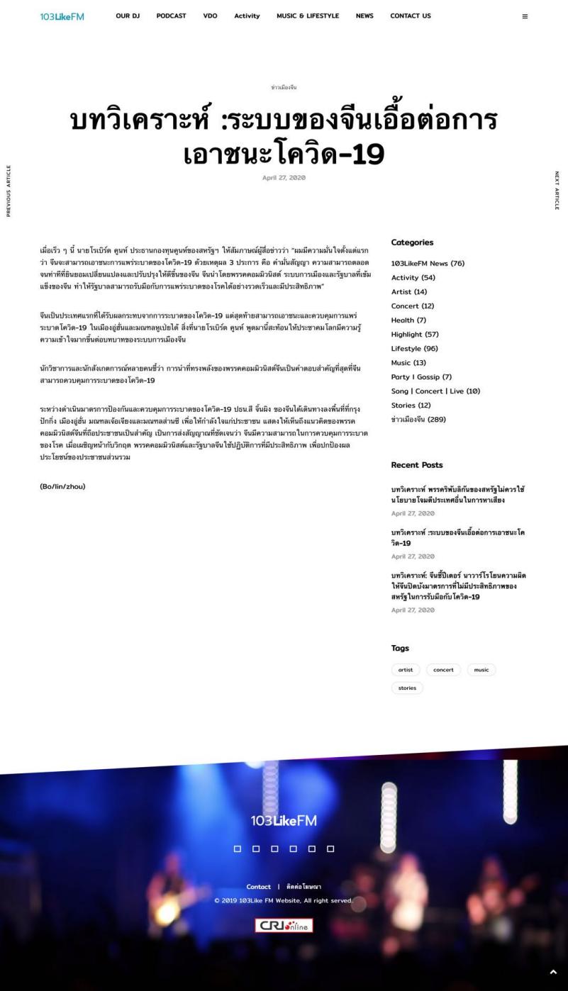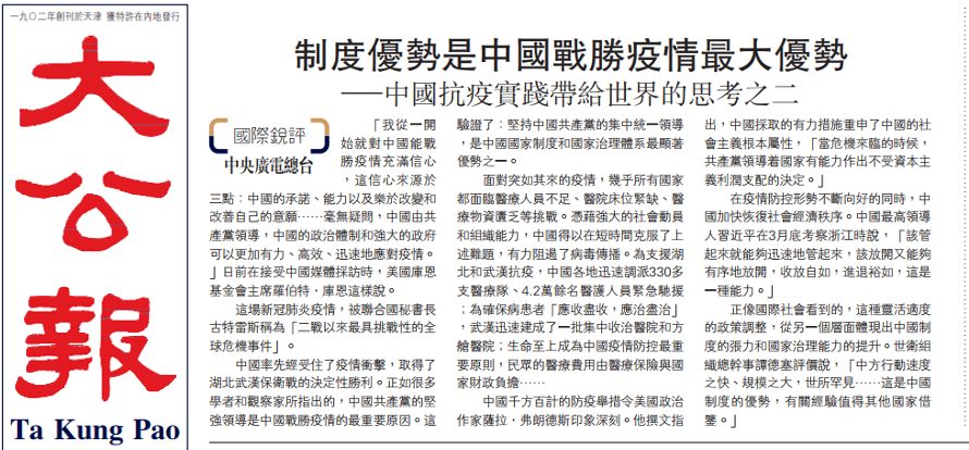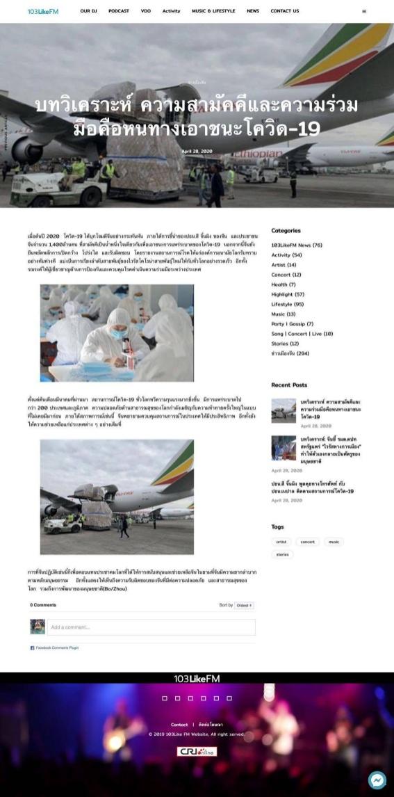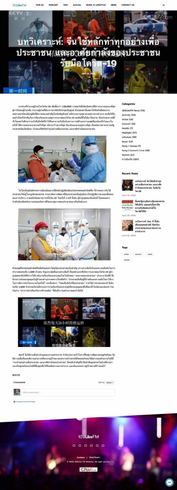 4月27日,泰國(guó)曼谷調(diào)頻臺(tái)Like FM103在其網(wǎng)站發(fā)表題為《制度優(yōu)勢(shì)是中國(guó)戰(zhàn)勝疫情的最大優(yōu)勢(shì)——中國(guó)抗疫實(shí)踐帶給世界的思考》的文章。文章稱,美國(guó)不少分析人士認(rèn)為,中國(guó)能在短時(shí)間取得疫情防控的重大勝利,得益于國(guó)家非凡的動(dòng)員能力和“集中力量辦大事”的制度優(yōu)勢(shì)。