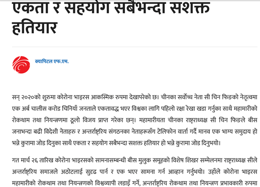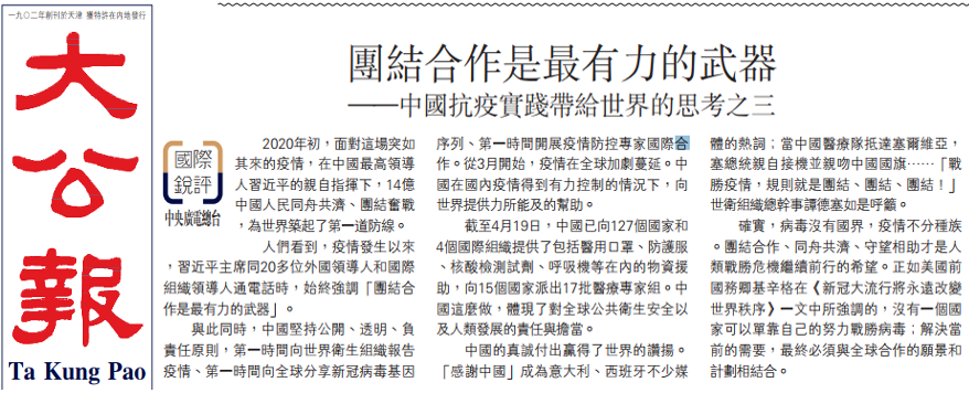 4月28日,泰國(guó)曼谷調(diào)頻臺(tái)FM103還在其網(wǎng)站刊發(fā)題為《團(tuán)結(jié)合作是最有力的武器——中國(guó)抗疫實(shí)踐帶給世界的思考》的文章。文章稱,人們看到,疫情發(fā)生以來(lái),習(xí)近平主席同20多位外國(guó)領(lǐng)導(dǎo)人和國(guó)際組織領(lǐng)導(dǎo)人通電話時(shí),始終強(qiáng)調(diào)“人類是一個(gè)命運(yùn)共同體”,強(qiáng)調(diào)“團(tuán)結(jié)合作是最有力的武器”。