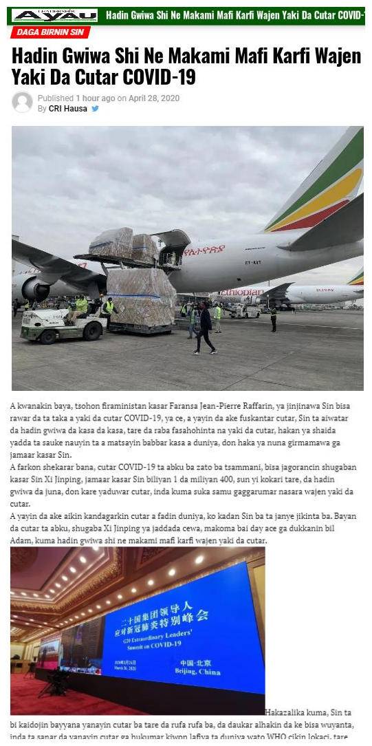 保加利亞媒體集團(tuán)旗下最大新聞網(wǎng)站《24小時(shí)》、老撾國(guó)家通訊社、尼泊爾都市在線網(wǎng)和尼日利亞豪薩文報(bào)《領(lǐng)導(dǎo)者報(bào)》等多家主流媒體也發(fā)表評(píng)論稱,疫情發(fā)生以來(lái),習(xí)近平主席同20多位外國(guó)領(lǐng)導(dǎo)人和國(guó)際組織領(lǐng)導(dǎo)人通電話時(shí),始終強(qiáng)調(diào)“人類是一個(gè)命運(yùn)共同體”,強(qiáng)調(diào)“團(tuán)結(jié)合作是最有力的武器”。