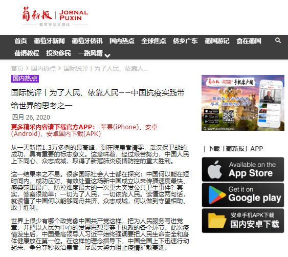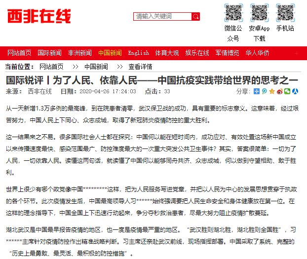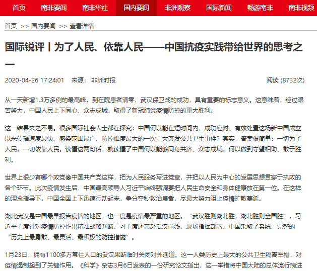 巴基斯坦中巴友誼網(wǎng)連續(xù)四天在其官網(wǎng)發(fā)表評(píng)論文章。文章稱,習(xí)近平總書記秉著“以人為本”的理念指揮了這場(chǎng)抗擊疫情的戰(zhàn)斗、中國(guó)人民團(tuán)結(jié)一致,以集體利益為重的精神、與世界合作抗疫的擔(dān)當(dāng)都是中國(guó)優(yōu)秀傳統(tǒng)文化的體現(xiàn)。