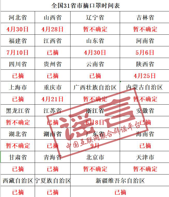 至此,真相水落石出,“全國(guó)31省市摘口罩時(shí)間表”是謠言!
