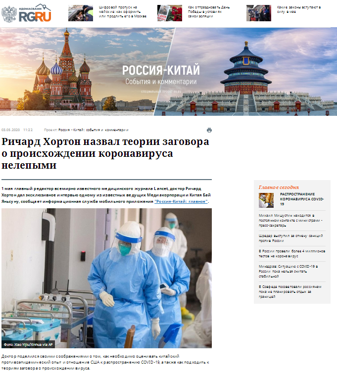 俄羅斯國家政府機(jī)關(guān)報(bào)《俄羅斯報(bào)》,發(fā)布題為《理查德·霍頓稱病毒起源陰謀論很可笑》的報(bào)道。報(bào)道稱,針對“病毒陰謀論”等謠言,霍頓說,這些說法非?尚Γ惨匾曀鼈!安《娟幹\論”對抗擊疫情是不利的,我們必須要了解病毒起源,并以科學(xué)的態(tài)度來研究它。