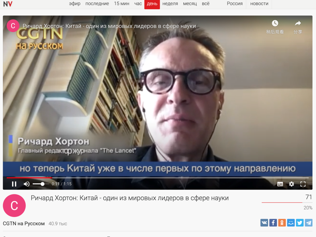 俄羅斯主流新聞網(wǎng)站newsvideo發(fā)布題為《〈柳葉刀〉總編霍頓:中國的科學(xué)發(fā)展已是世界領(lǐng)先水平》和《〈柳葉刀〉總編霍頓:中國的經(jīng)驗(yàn)是快速果斷的決策 中國有應(yīng)對SARS的經(jīng)驗(yàn)》的報(bào)道。報(bào)道稱,中國醫(yī)生和科學(xué)家作出了最為杰出的貢獻(xiàn),有一些國家的領(lǐng)導(dǎo)人批評中國,這是不公平的,也是錯(cuò)誤的,我們應(yīng)該感謝抗擊疫情的中國醫(yī)生和科學(xué)家!