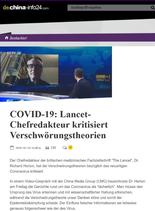 《歐洲時(shí)報(bào)》德文網(wǎng)發(fā)布題為《新冠病毒:柳葉刀主編批評陰謀論》的報(bào)道