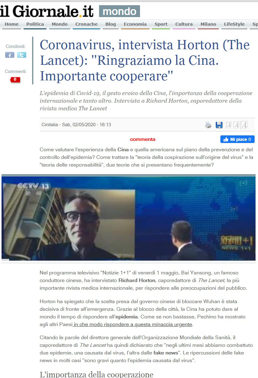 意大利《日報(bào)》:《〈柳葉刀〉總編接受專訪:感謝中國在抗擊疫情中作出的努力,國際合作至關(guān)重要》