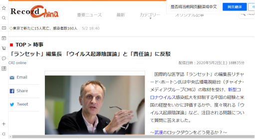 日本最大中國信息門戶網(wǎng)站“Record China” 5月2日發(fā)布題為《〈柳葉刀〉總編霍頓反駁 “病毒起源陰謀論”和“責(zé)任論”》的文章。報(bào)道稱,《柳葉刀》總編霍頓說,指責(zé)中國是疫情源頭沒有用、也不真實(shí),中國有很多經(jīng)驗(yàn)值得世界學(xué)習(xí)。