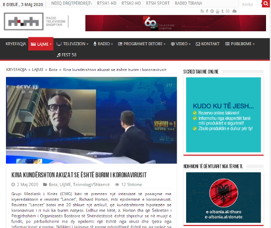 阿爾巴尼亞國家廣播電視臺(tái)官網(wǎng)RTSH:《中國反擊病毒起源論》