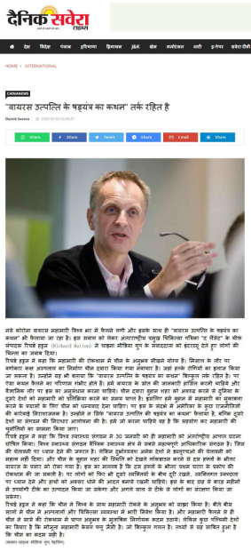 印度主流報(bào)紙《每日晨報(bào)》官網(wǎng)5月3日轉(zhuǎn)發(fā)總臺(tái)印地語部題為《“病毒起源陰謀論”站不住腳》的報(bào)道,國際著名醫(yī)學(xué)雜志《柳葉刀》的主編理查德·霍頓在接受總臺(tái)采訪時(shí)表示,“病毒起源陰謀論”和“責(zé)任論”是無稽之談,根本站不住腳。