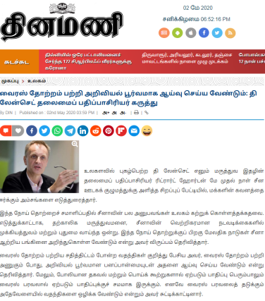 印度泰米爾文主流媒體《每日鐘聲報(bào)》網(wǎng)站報(bào)道《〈柳葉刀〉主編表示應(yīng)對病毒起源進(jìn)行科學(xué)調(diào)查》。