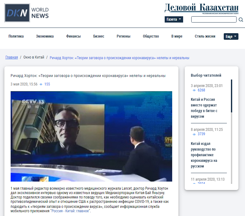 哈薩克斯坦國家經(jīng)濟(jì)周報(bào)《哈薩克斯坦實(shí)業(yè)報(bào)》:《〈柳葉刀〉總編接受白巖松專訪》《理查德·霍頓:病毒起源陰謀論是荒唐可笑的》