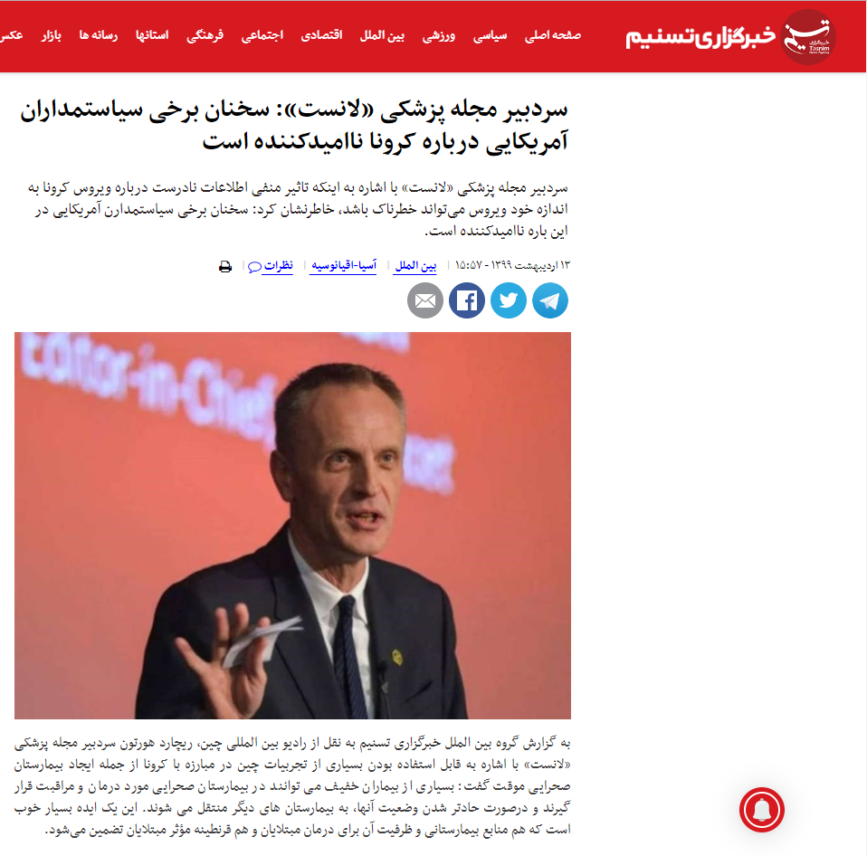伊朗塔斯尼姆通訊社報(bào)道《〈柳葉刀〉醫(yī)學(xué)雜志主編:一些美國政客有關(guān)新冠肺炎的言論讓人失望》。報(bào)道稱,“病毒陰謀論”對抗擊疫情是不利的,我們必須要了解病毒起源,并以科學(xué)的態(tài)度來研究它。