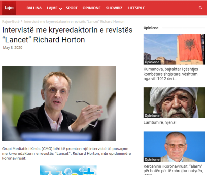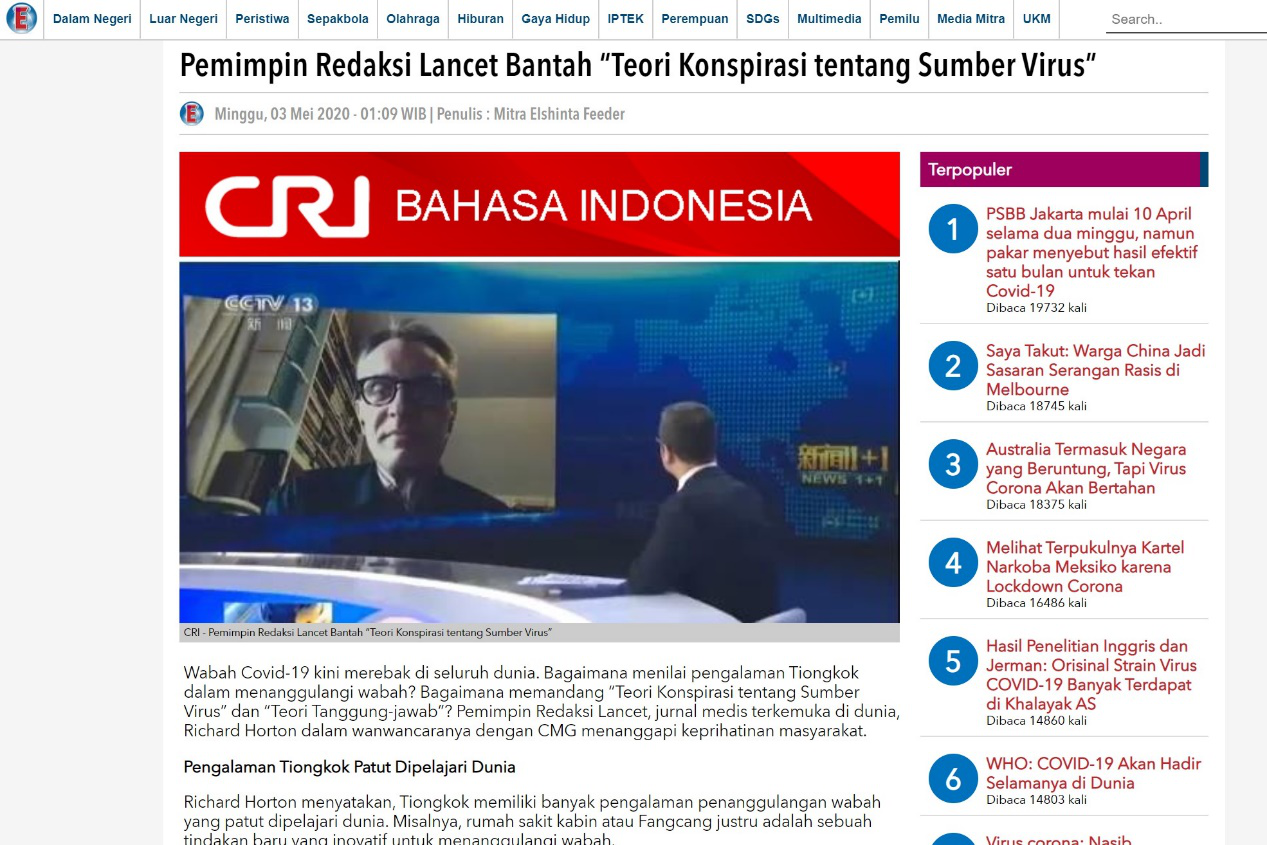 伊朗英語新聞電視臺(tái)(Press TV)引用國際視頻通訊社發(fā)布的總臺(tái)新聞素材報(bào)道稱,醫(yī)學(xué)雜志《柳葉刀》的總編理查德·霍頓指責(zé)西方國家睜一只眼閉一只眼:“在1月的最后一周我們已經(jīng)了解這些情況,但是大部分西方國家比如美國浪費(fèi)了整個(gè)2月還有3月初的時(shí)間,這就是人為造成的悲劇!被纛D贊揚(yáng)中國應(yīng)對疫情的反應(yīng),稱其比其他國家做得更好;纛D認(rèn)為中國之所以反應(yīng)如此迅速和果斷得益于非典的經(jīng)驗(yàn),并稱中國有科學(xué)力量和醫(yī)療能力來應(yīng)對此次疫情。