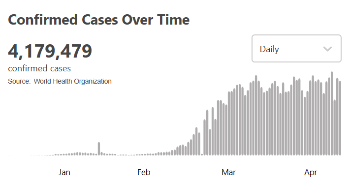 根據(jù)世衛(wèi)組織最新實時統(tǒng)計數(shù)據(jù),截至歐洲中部夏令時間5月13日18時50分(北京時間5月14日0時50分),全球確診新冠肺炎4179479例,死亡287525例,中國以外超過409萬例。(總臺記者 朱赫)