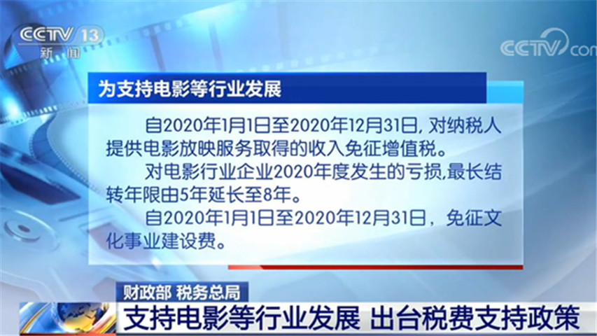 央視網(wǎng)消息:財(cái)政部、國(guó)家稅務(wù)總局昨天(14日)發(fā)布公告,為支持電影等行業(yè)發(fā)展,自2020年1月1日至2020年12月31日,對(duì)納稅人提供電影放映服務(wù)取得的收入免征增值稅。