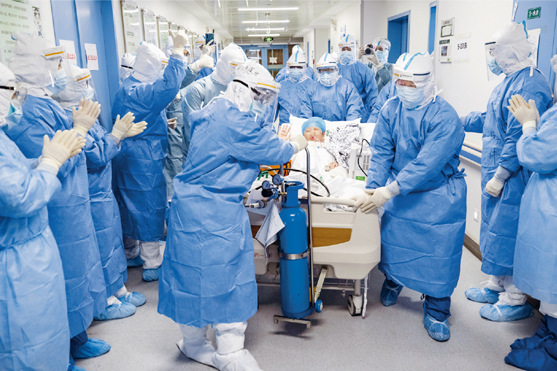 在此次抗疫斗爭中,全國廣大醫(yī)務(wù)工作者不忘初心、牢記使命,響應(yīng)黨的號召,義無反顧沖上疫情防控第一線,同時(shí)間賽跑,與病魔較量,頑強(qiáng)拼搏、日夜奮戰(zhàn),展現(xiàn)了對黨、對人民高度負(fù)責(zé)的精神面貌,生動詮釋了偉大的中華民族精神。圖為2020年4月12日,北京協(xié)和醫(yī)院醫(yī)療隊(duì)隊(duì)員與武漢同濟(jì)醫(yī)院醫(yī)務(wù)人員共同將病區(qū)最后一名新冠肺炎危重癥患者轉(zhuǎn)往武漢同濟(jì)醫(yī)院中法新城院區(qū)ICU。 新華社記者 沈伯韓/攝