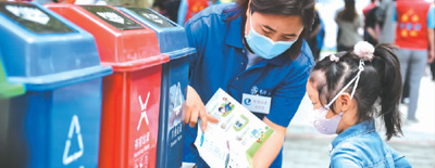在北京市東城區(qū)西花市南里東區(qū),垃圾分類指導(dǎo)員向孩子介紹指導(dǎo)手冊(cè)上的垃圾分類小知識(shí)。