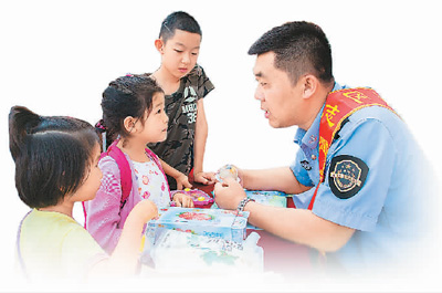 內(nèi)蒙古自治區(qū)呼和浩特市玉泉區(qū)清泉街社區(qū)志愿者在為小朋友講解食品安全常識(shí)。