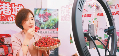 5月30日,網(wǎng)絡(luò)主播在河北省秦皇島市海港區(qū)杜莊大櫻桃采摘節(jié)上幫助果農(nóng)直播銷售櫻桃。