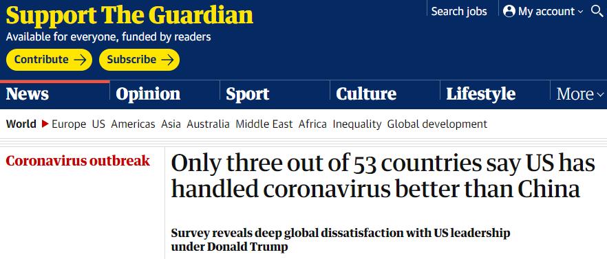英國(guó)《衛(wèi)報(bào)》也報(bào)道了這一民調(diào),但不知道是誤差還是什么原因,該報(bào)僅在報(bào)道中稱有三個(gè)國(guó)家和地區(qū)認(rèn)為美國(guó)好,遺漏了日本。