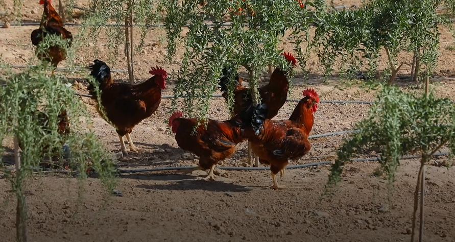 “枸杞樹上掛紅果,枸杞樹下養(yǎng)公雞” 。總臺央視記者看到,枸杞樹蔭下雞群有的啄食,有的嬉戲,像不像一幅《花下雄雞圖》?原來利用枸杞基地的生態(tài)資源散養(yǎng)生態(tài)雞,無論肉質,還是產蛋,都很暢銷。