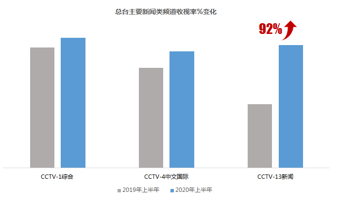 2020上半年,總臺(tái)在全國(guó)新聞?lì)惞?jié)目市場(chǎng)占有率超過(guò)八成,全國(guó)觀眾81%的新聞收視來(lái)自中央廣播電視總臺(tái)。