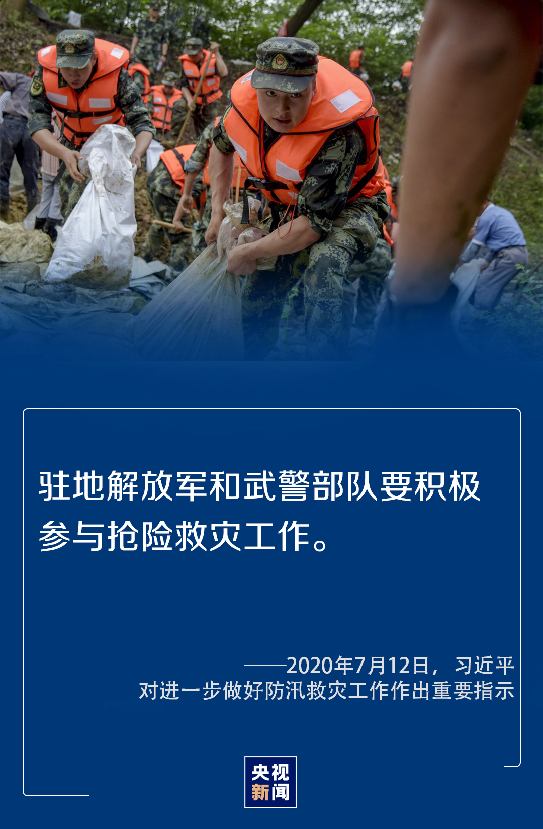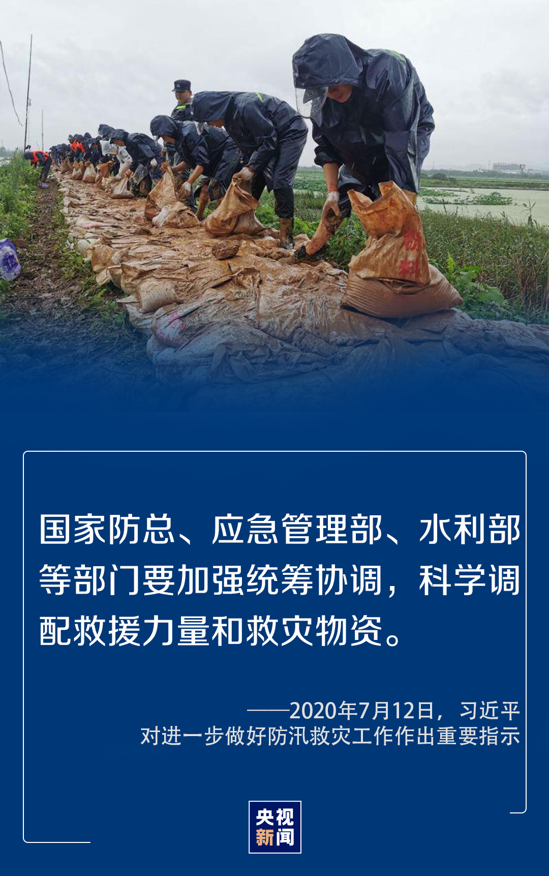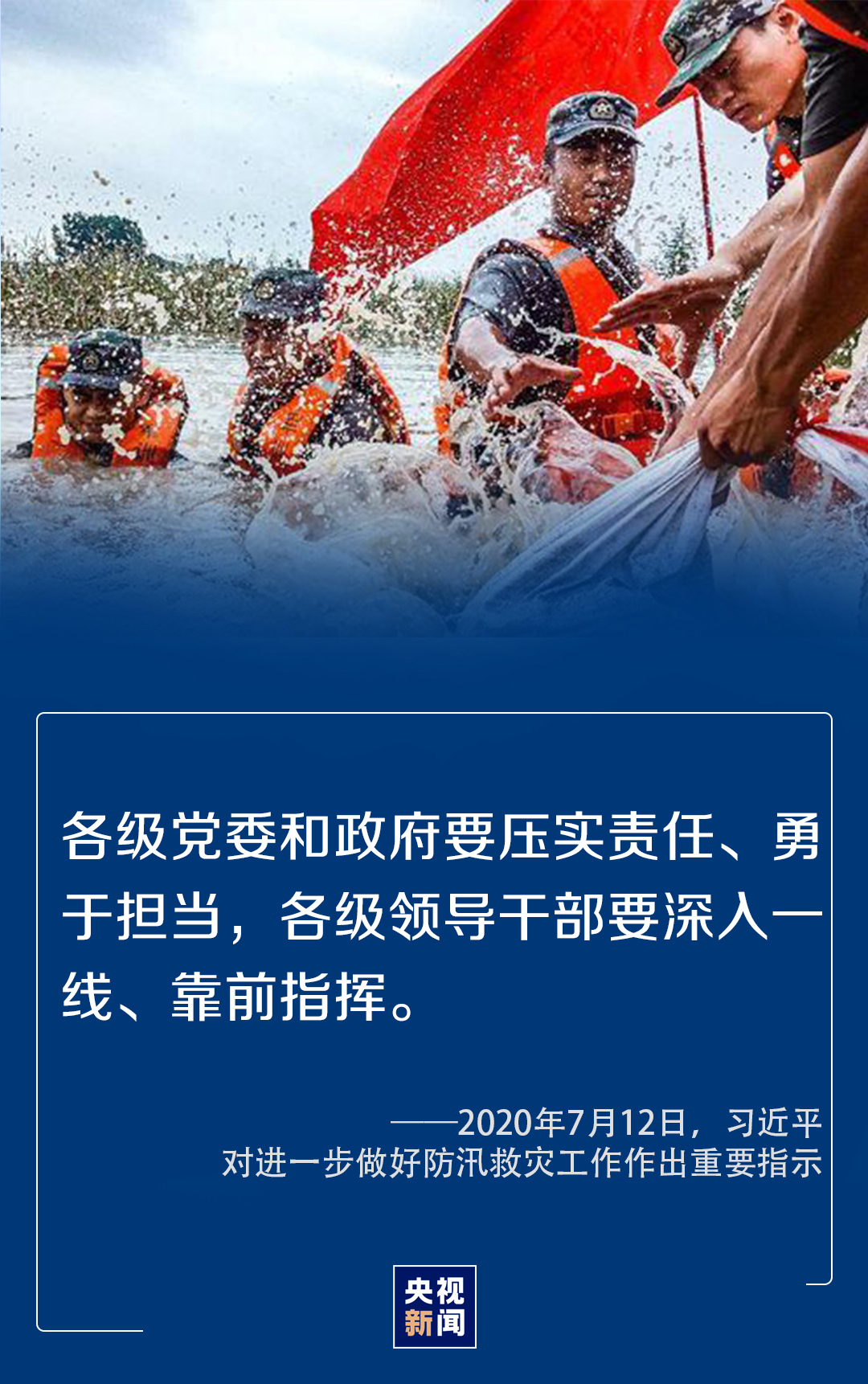 7月12日,習(xí)近平對(duì)進(jìn)一步做好防汛救災(zāi)工作作出重要指示時(shí)指出,各級(jí)領(lǐng)導(dǎo)干部要深入一線、靠前指揮,組織廣大干部群眾,采取更加有力有效的措施,切實(shí)做好監(jiān)測(cè)預(yù)警、堤庫(kù)排查、應(yīng)急處置、受災(zāi)群眾安置等各項(xiàng)工作,全力搶險(xiǎn)救援,盡最大努力保障人民群眾生命財(cái)產(chǎn)安全。