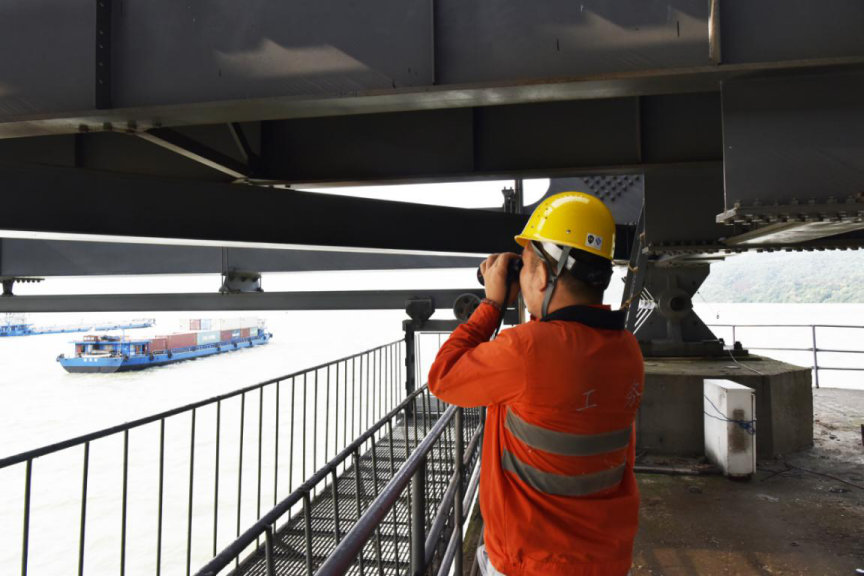 “大橋上安裝了自動(dòng)水位測(cè)量?jī)x,可以實(shí)時(shí)向安全調(diào)度中心報(bào)告水位情況,我們還可以通過(guò)監(jiān)控?cái)z像頭觀察過(guò)往船只,發(fā)現(xiàn)超高超限的大型船只,要立即用喇叭呼停,防止撞上大橋鋼梁。”面對(duì)連日來(lái)大雨引發(fā)的洪水,黨頡明和工友盯守在大橋上,發(fā)現(xiàn)安全隱患要及時(shí)啟動(dòng)警報(bào)系統(tǒng)。