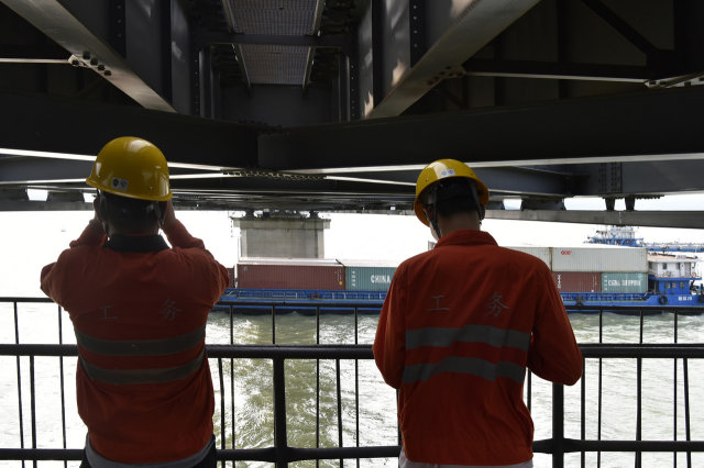 除了要防止大船撞上大橋,黨頡明和工友還要定時(shí)穿過(guò)290米的箱梁到鋼梁下,觀察大橋螺栓有沒(méi)有斷裂,橋墩有沒(méi)有被船只擦傷,發(fā)現(xiàn)故障或隱患都需要及時(shí)排除。