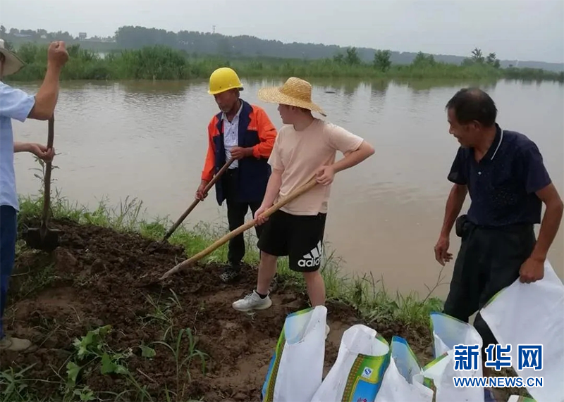大學(xué)生葉欣煒(右二)和村民一起加固堤防。新華網(wǎng)發(fā)