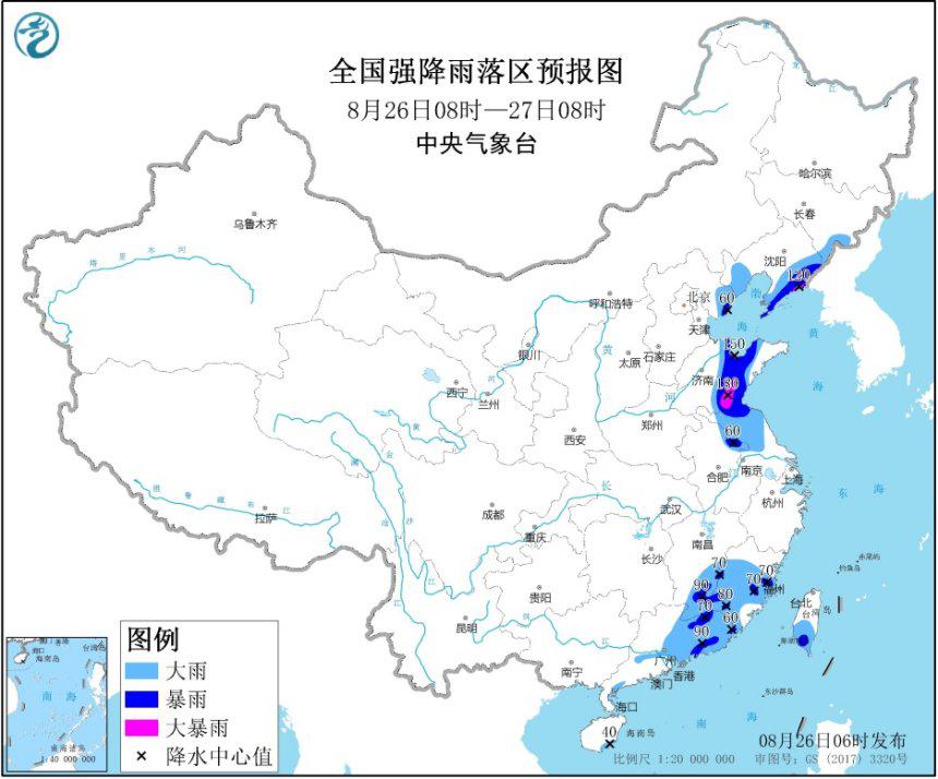 預(yù)計(jì),8月26日08時(shí)至27日08時(shí),吉林東南部、遼寧東部和西南部、河北東北部、山東中東部、江蘇中北部、安徽東北部、江西東南部、福建中南部、廣東中東部、海南島、臺(tái)灣島南部等地的部分地區(qū)有大到暴雨,其中,山東中部、遼寧東部等地局地有大暴雨(100~180毫米)。上述部分地區(qū)伴有短時(shí)強(qiáng)降水(最大小時(shí)降雨量20~50毫米,局地可超過60毫米),局地有雷暴大風(fēng)等強(qiáng)對(duì)流天氣。