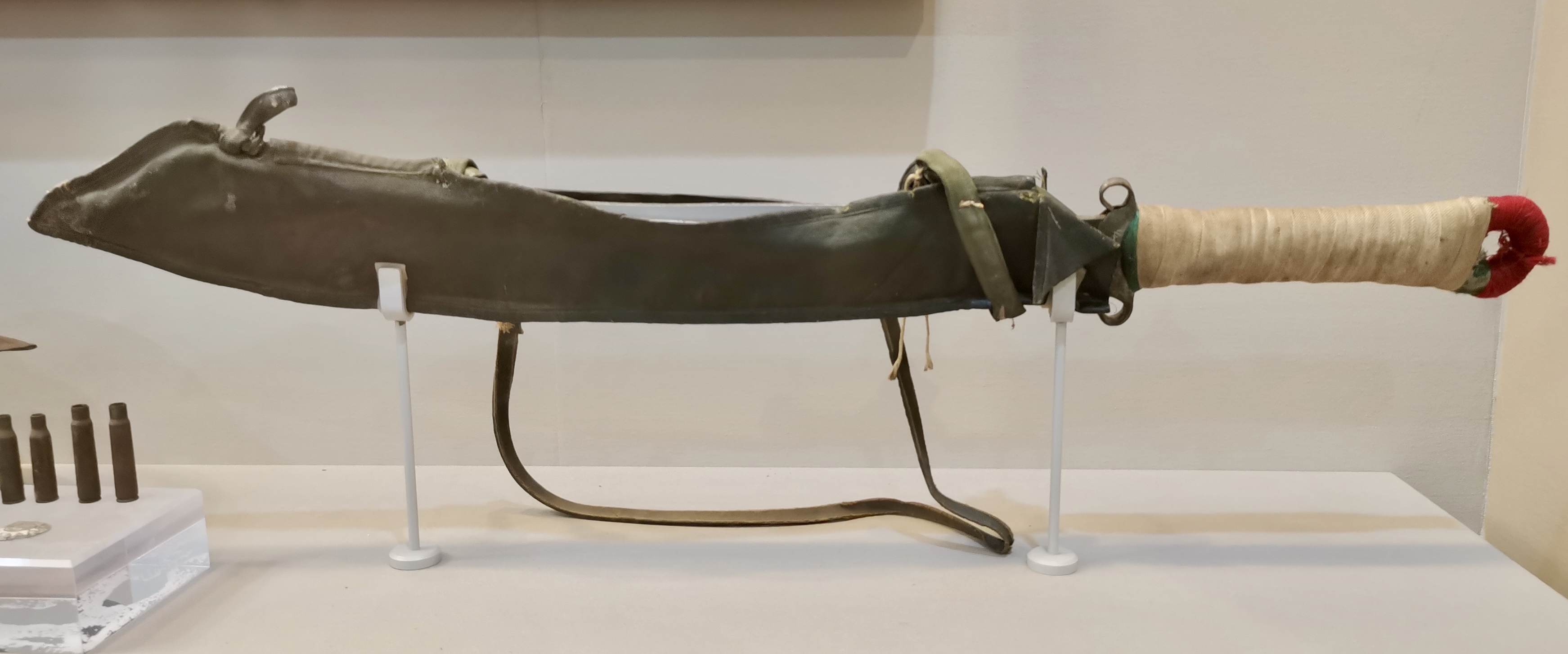 △第29軍士兵在盧溝橋抵抗日軍時(shí)使用過(guò)的大刀。(總臺(tái)央視記者范凱拍攝)