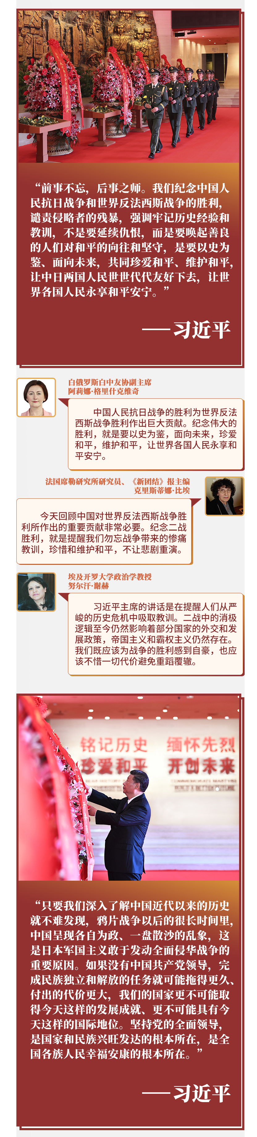 習(xí)近平在講話中全面回顧中國(guó)人民抗日戰(zhàn)爭(zhēng)的偉大勝利,深入總結(jié)中國(guó)人民抗日戰(zhàn)爭(zhēng)勝利的歷史啟示,明確宣示中國(guó)走和平發(fā)展道路、維護(hù)世界和平、推動(dòng)構(gòu)建人類命運(yùn)共同體的堅(jiān)定決心,向世界傳遞豐富信息——