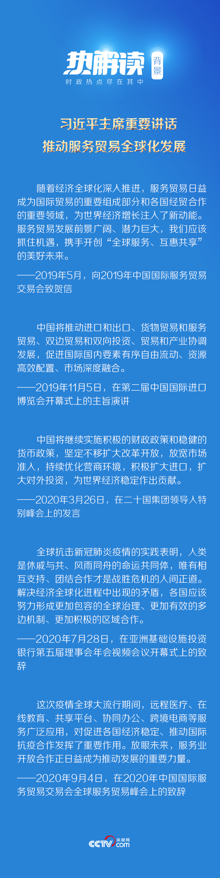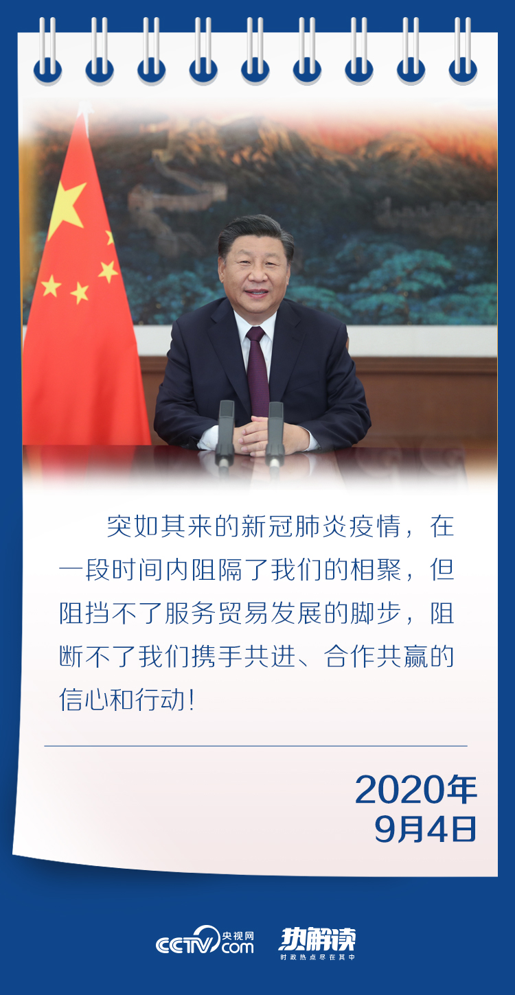 習(xí)近平主席在2020年中國(guó)國(guó)際服務(wù)貿(mào)易交易會(huì)全球服務(wù)貿(mào)易峰會(huì)的致辭中提出3點(diǎn)倡議:共同營(yíng)造開(kāi)放包容的合作環(huán)境;共同激活創(chuàng)新引領(lǐng)的合作動(dòng)能;共同開(kāi)創(chuàng)互利共贏的合作局面。